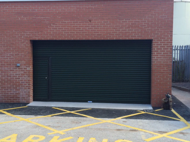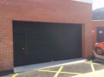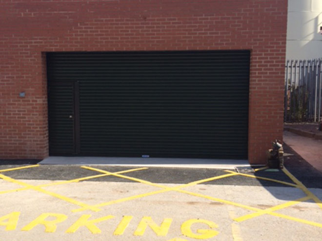 We supplied a new Powdercoated Electrically Operated Roller Shutter Door complete with integral wicket Gate.