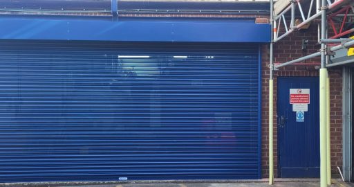 We supplied a new Powdercoated Electrically Operated Roller Shutter Door complete with integral wicket Gate.
